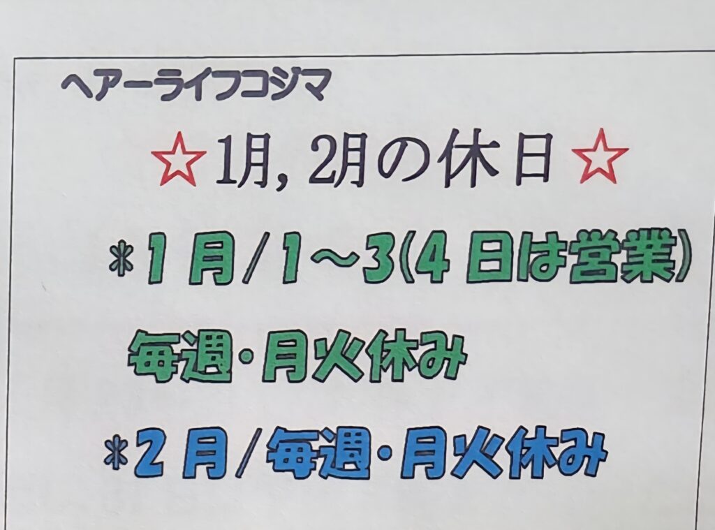 忙しくされていて年末に髪をカットできなかったお客様、一年の始まりにぜひ髪をスッキリと整えて気持ちよくスタートしませんか?